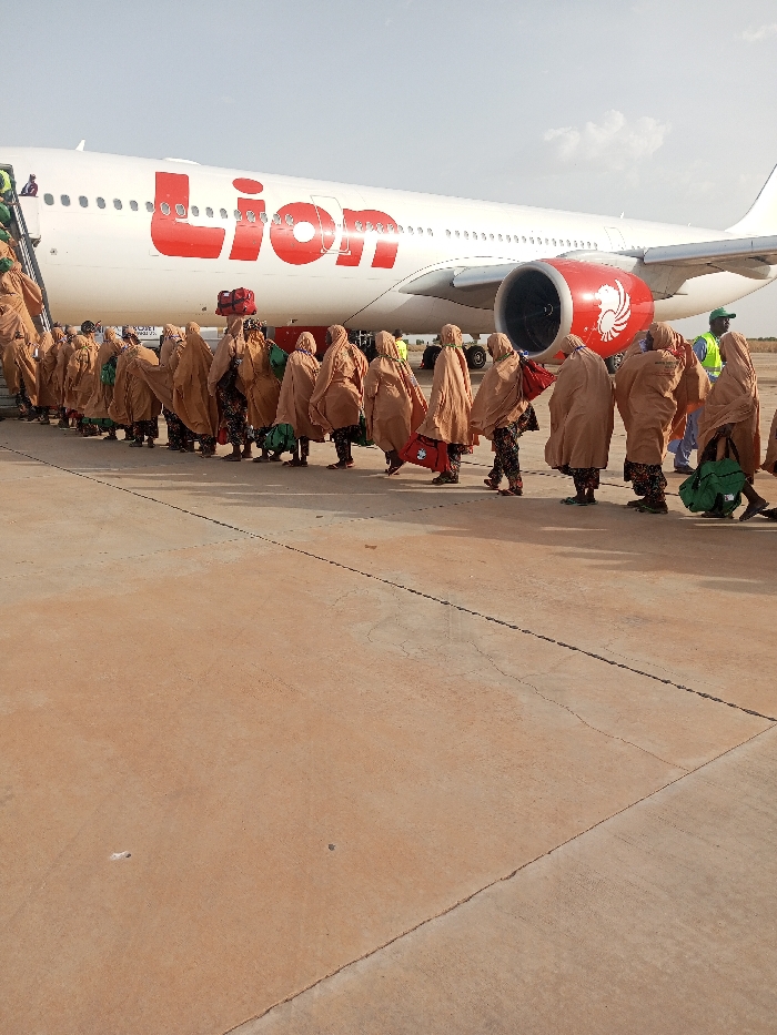 A white and red airplane with the word "Lion" in large red letters on the side is parked on an asphalt tarmac. A line of at least 20 people, primarily women wearing tan robes, are standing in line waiting to board the airplane. There are two men in green shirts and baseball caps behind the women. The women are carrying bags and small luggage items. One woman is carrying a red suitcase. The sky is clear and blue with a few white clouds. The location is an airport in Amburse, Nigeria, at the coordinates 12.485 latitude and 4.371 longitude.