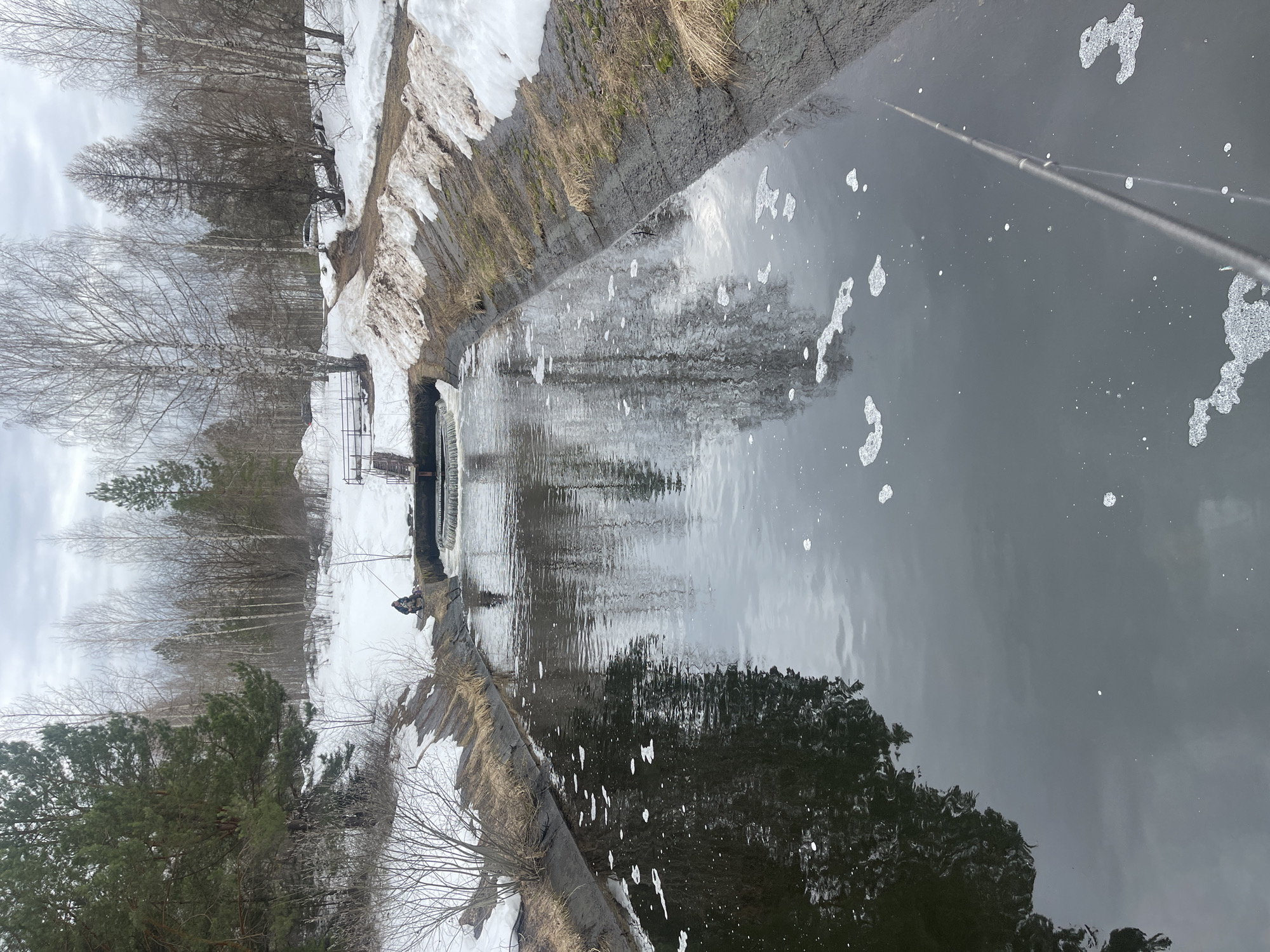 The image depicts a narrow canal or waterway in a wintry landscape. Snow covers the banks on both sides, with patches of dry grass visible. Bare trees and some evergreen trees stand along the left bank. A small waterfall or weir is visible mid-frame. The water is dark and reflects the sky and surrounding trees. There is white foam or bubbles floating on the water's surface. A fishing rod extends into the water on the right side of the image. A person in winter attire is fishing on the near side of the waterfall structure. The location is Chernushka, Russia.