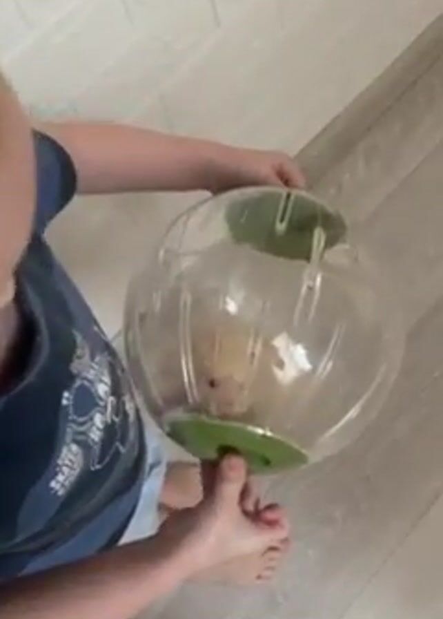 A young child with reddish-brown hair is holding a clear plastic ball with green trim. Inside the ball, a small hamster is visible. The child is wearing a blue and black striped shirt and is barefoot. The setting appears to be indoors, with a white brick wall in the background and light-colored flooring. The child is turning the ball over in their hands, seemingly observing the hamster inside.