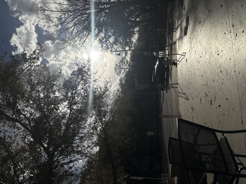This image depicts an outdoor urban scene in Gainesville, Florida, specifically along University Avenue, indicated by a visible street sign. The scene is illuminated by strong sunlight from the upper right, creating significant lens flare and deep shadows in the foreground and on the left side of the frame. The sky is partially cloudy with bright white and grey formations against a blue background. In the immediate foreground, a paved surface, likely concrete, is visible, strewn with scattered brown leaves. Two dark, metal mesh chairs and a table are partially visible on the far left, situated in shadow, suggesting an outdoor seating area. Several vertical metal posts, potentially bicycle racks or bollards, are present on the right side of the paved area, casting long, distinct shadows across the sunlit ground. The midground features a two-lane asphalt road (University Avenue) running horizontally. A dark-colored sedan is either parked or in motion on the right side of the road, facing right, partially obscured by shadows and sun glare. A utility pole on the left displays a "UNIVERSITY AVE" street sign with "GAINESVILLE FL" below it, and another yellow rectangular sign is partially visible. Further to the right, a traffic light pole with a traffic signal and a street lamp extends upwards. Buildings are visible on the far left beyond the road, largely in shadow. The background consists of numerous trees with varied foliage, some appearing deciduous, others evergreen, lining the street and extending into the distance. No individuals are visible within the frame. No discernible actions or interactions are occurring.