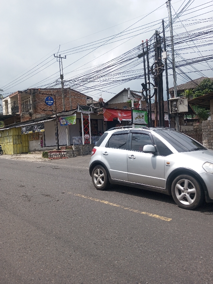 A silver hatchback travels on an asphalt road marked with a yellow line. The backdrop includes a two-story brick building with a blue sign and several small storefronts with awnings and banners. Overlapping power lines crisscross above the buildings and a utility pole. The day appears overcast.