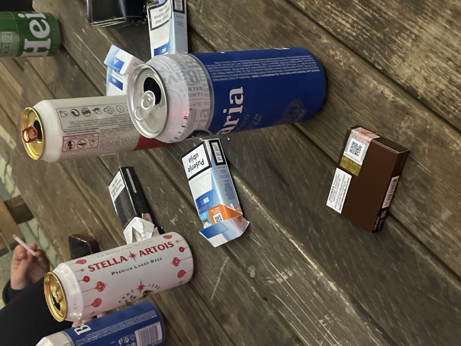 A collection of discarded items rests on a wooden surface, including a green Heineken can, a white and red Stella Artois can, and a blue Birra Moretti can