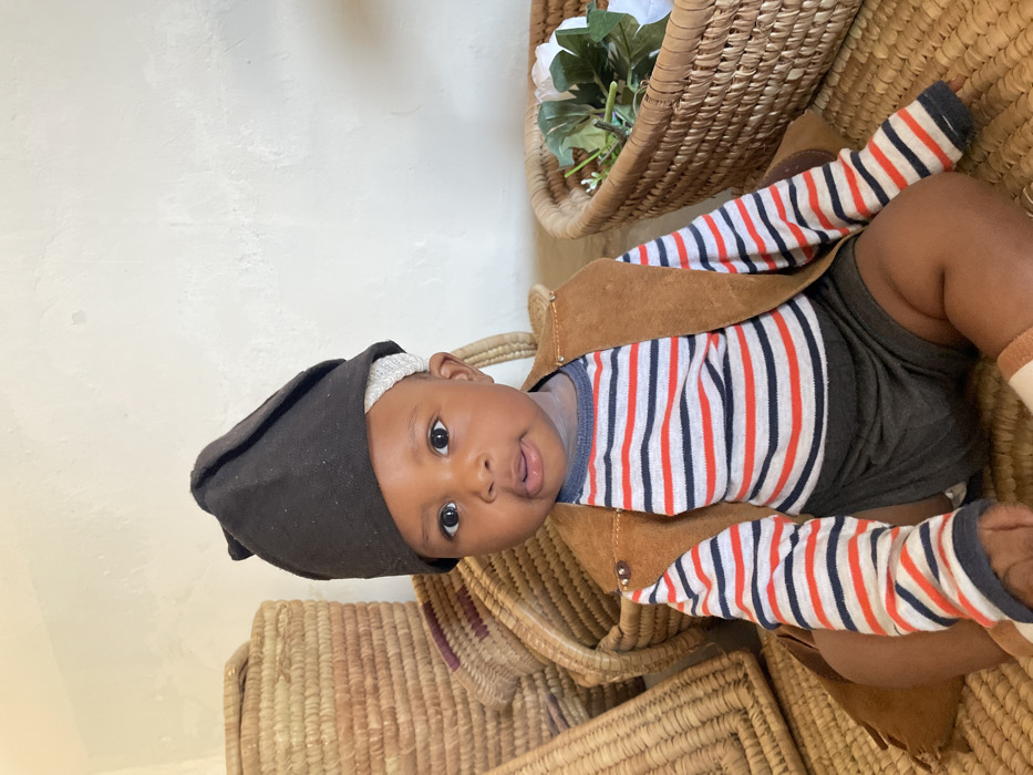The image displays an infant positioned centrally, sitting on a light brown woven mat indoors. The scene is located in Jos, Nigeria. The infant wears a dark conical cap over a lighter-colored headwrap, a long-sleeved shirt with alternating white, red, and dark blue horizontal stripes, a sleeveless brown vest with metallic studs on the lapel, and dark grey shorts. Light-colored socks with horizontal stripes are visible on the feet. The infant has dark skin, dark eyes, and a neutral expression with a slightly open mouth, looking directly forward. To the left and behind the infant, multiple light brown woven baskets are stacked. To the right, another circular woven basket contains artificial white flowers and green foliage. The background features a plain, light-colored, textured wall.