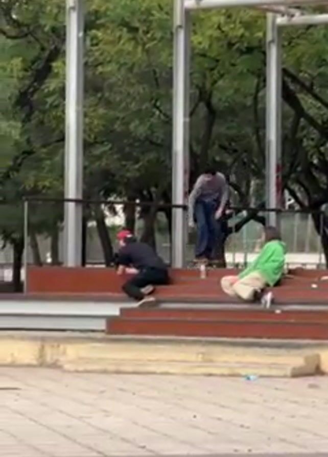 A young man attempts a skateboarding trick, falls, and lands on his back. The video starts with a skateboarder in a gray shirt and blue pants standing on a set of brown stairs. He attempts a trick, lands, and immediately loses his balance, landing hard on his back on the light gray and brown tiled pavement. The skateboard slides away from him. A photographer with a red hat and black shirt kneels on the stairs, likely filming the stunt. Another person sits to the right wearing a lime green jacket and khaki pants. Several skateboards and trash are scattered on the pavement. A large modern gazebo-like structure is behind the stairs, framed by green trees.