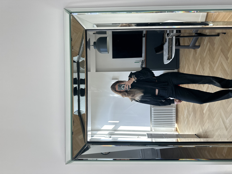 The image depicts a full-length mirror selfie taken indoors within an apartment located in Brussels, Belgium