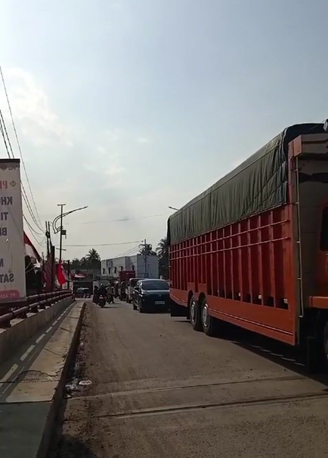 view of a busy street during the day. On the right side of the road, a large, red truck with a covered bed is stopped. To the left, there is a narrow sidewalk, a road barrier, and a banner with text written on it. Cars and motorcycles are seen in the distance, moving along the road. The road surface is dry and appears to be in average condition. Power lines and streetlights are visible overhead. The sky is mostly clear with some clouds.
