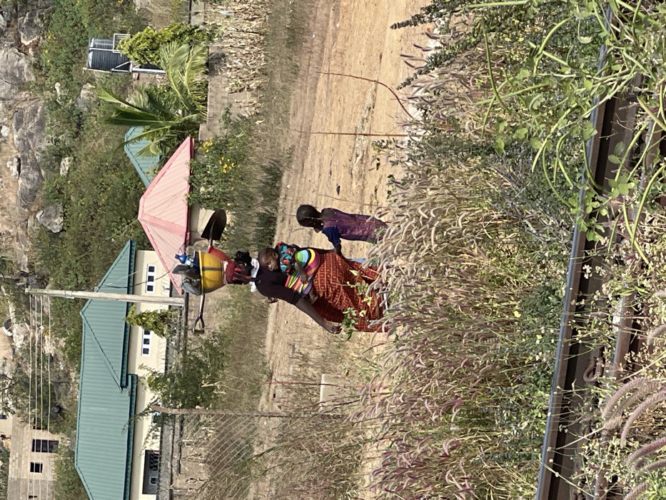 This image, taken in Gura Top, Nigeria, depicts an outdoor scene featuring an adult female walking with two children along an unpaved path, with a railway track in the foreground and a rural/semi-urban landscape in the background. **People:** An adult female, dressed in a dark top, a light collar, and a red, patterned wrapper, is positioned centrally, walking from left to right. She carries an infant on her back, secured by a brightly striped, multicolored fabric wrap. The infant wears a dark top and faces right. A young child, wearing a purple garment, walks to the right of the adult, slightly behind her, with their right hand near the adult's wrapper. **Actions:** The adult female and two children are in motion, walking across the dirt path. The adult is simultaneously carrying goods on her head and an infant on her back. **Objects and Subjects:** On the adult female's head, a yellow basin contains various items, including a blue plastic bottle. A shovel and a partial frame of what appears to be a wheelbarrow or similar utility item are also balanced on her head. In the immediate foreground, tall grasses with purple and green hues obscure a railway track, which consists of two parallel metal rails laid on a bed of stones and dirt, with vegetation growing between the sleepers. The ground where the individuals walk is a light brown, dry, unpaved dirt surface. **Environment:** In the background, beyond a chain-link fence on the left, are several structures. A prominent building with a light-colored facade and a dark green, multi-gabled roof is visible, featuring small, dark-framed windows. To its right, another building with a light facade and a reddish-pink conical roof is present. A water tank on a stand is visible behind the reddish-pink roofed building. A utility pole stands to the left of the green-roofed building. Further right, a section of dried corn or similar crops is visible. The far background features steep, rocky hills covered in sparse vegetation, under a clear, bright sky. The scene is illuminated by strong sunlight, casting minimal shadows.