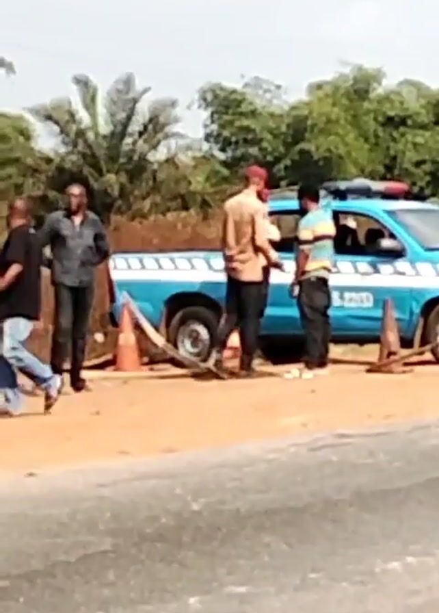 roadside scene with a blue and white pickup truck with what appears to be emergency lights on top, parked near some orange traffic cones. Several people are standing near the truck, including at least one individual wearing a red cap. A motorcycle passes by in the foreground, partially obscuring the view. The background includes trees and other vegetation. The road appears to be paved but somewhat worn.