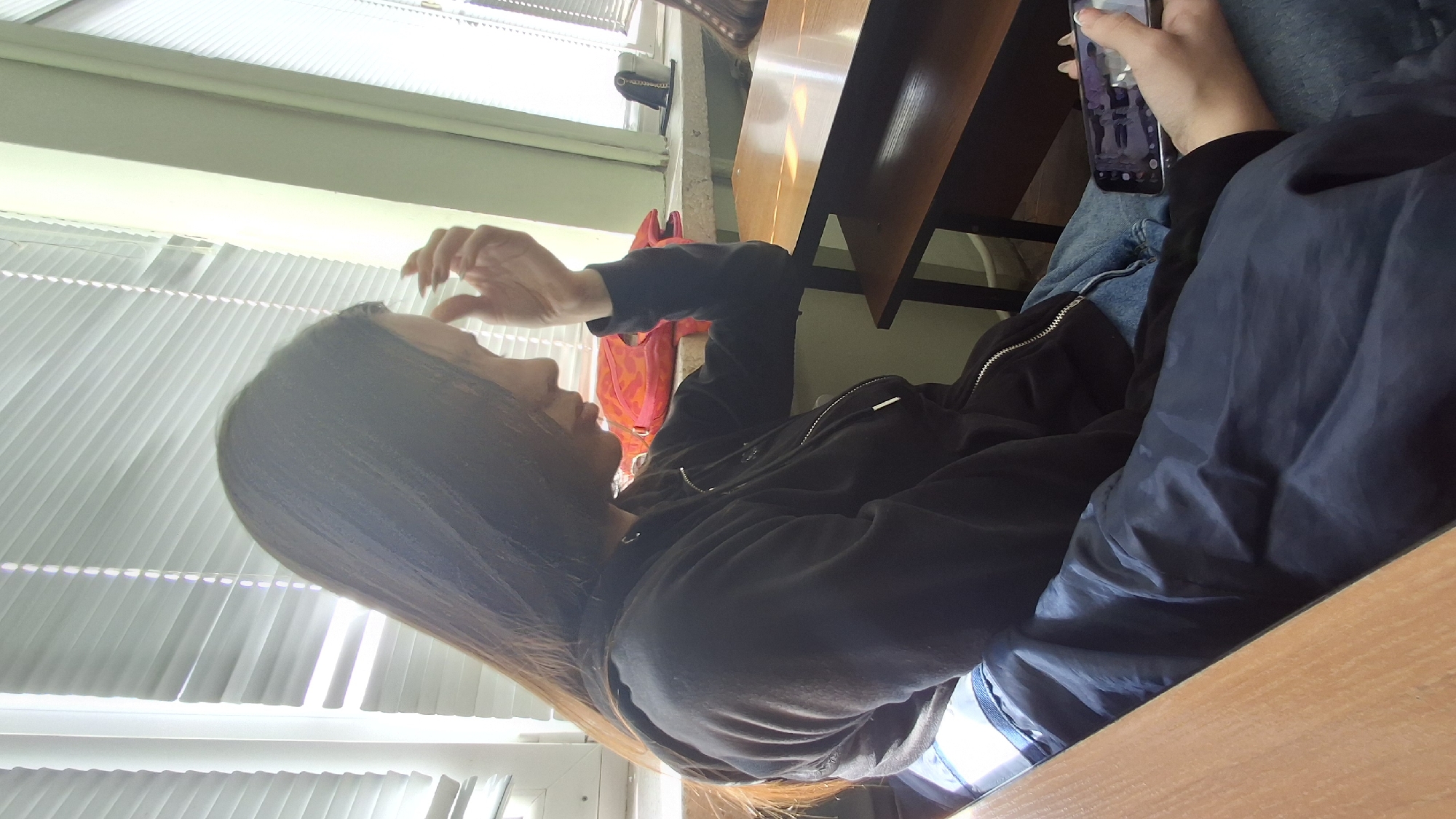 An individual with long, dark hair, wearing a dark zippered hoodie, blue jeans, and a dark blue garment draped over the lap, is seated at a wooden desk in an indoor environment. The subject's right hand is raised, with fingers near the forehead. The left hand holds a black smartphone, which displays an image or video on its screen. The setting features multiple windows with white horizontal blinds, allowing bright natural light to enter. A light green wall section is visible. On a windowsill in the background, a vibrant red/orange bag and a small dark object are present. The furniture consists of light brown wooden desks, consistent with a classroom or office. The scene is located in Silistra, Bulgaria.