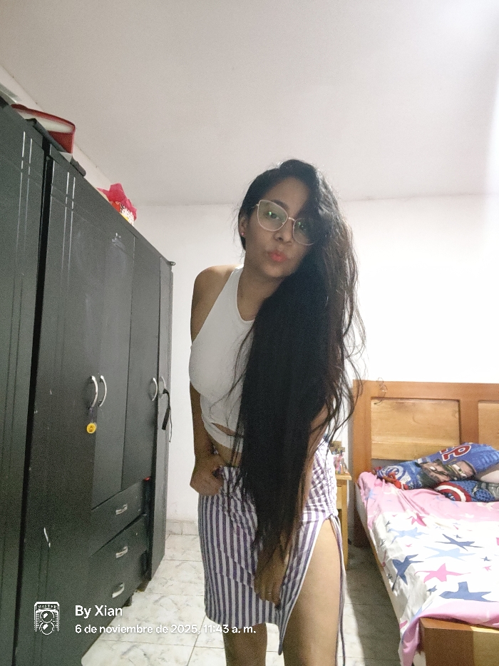 This image captures a female individual standing in an indoor residential setting. The subject, centered in the frame, has long, dark hair and wears light-framed eyeglasses. She is dressed in a white halter-neck crop top and a knee-length skirt with vertical white and purple stripes, featuring a high slit on the right side. Her lips are pursed, and her left hand is positioned near the waistband of her skirt. To the subject's left, a dark-colored wardrobe or armoire with two doors and two drawers is visible. Silver-colored handles are present on the doors and drawers, with a yellow tag hanging from one door handle. Red objects are placed on top of the wardrobe. To the subject's right, a wooden bed frame with a headboard is present. The bed is made with pink bedding adorned with light blue star-like patterns, and several pillows are visible, one featuring a design consistent with a Captain America shield. The floor is covered with light-colored square tiles, and the walls are white. The scene is brightly lit. A digital overlay in the lower-left corner displays "By Xian" and the timestamp "6 de noviembre de 2025, 11:43 a. m." While the language of the timestamp is consistent with Cali, Colombia, the image does not contain specific visual information to identify a precise location within the city of Cali; it depicts a generic indoor bedroom environment.