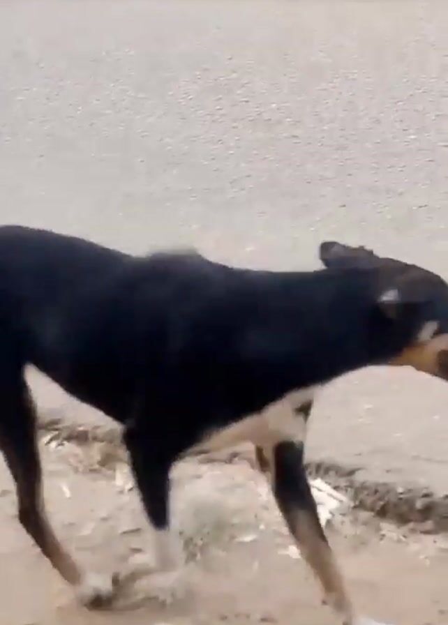 dark-colored dog standing on a dirt surface next to a paved road. The dog has black fur on its back and head, with tan and white markings on its legs and underbelly. The dog is facing away from the camera at an angle, looking towards the road. There is a wooden post partially visible in the foreground. The ground is dirt and gravel, with some debris. The road is made of asphalt or concrete.