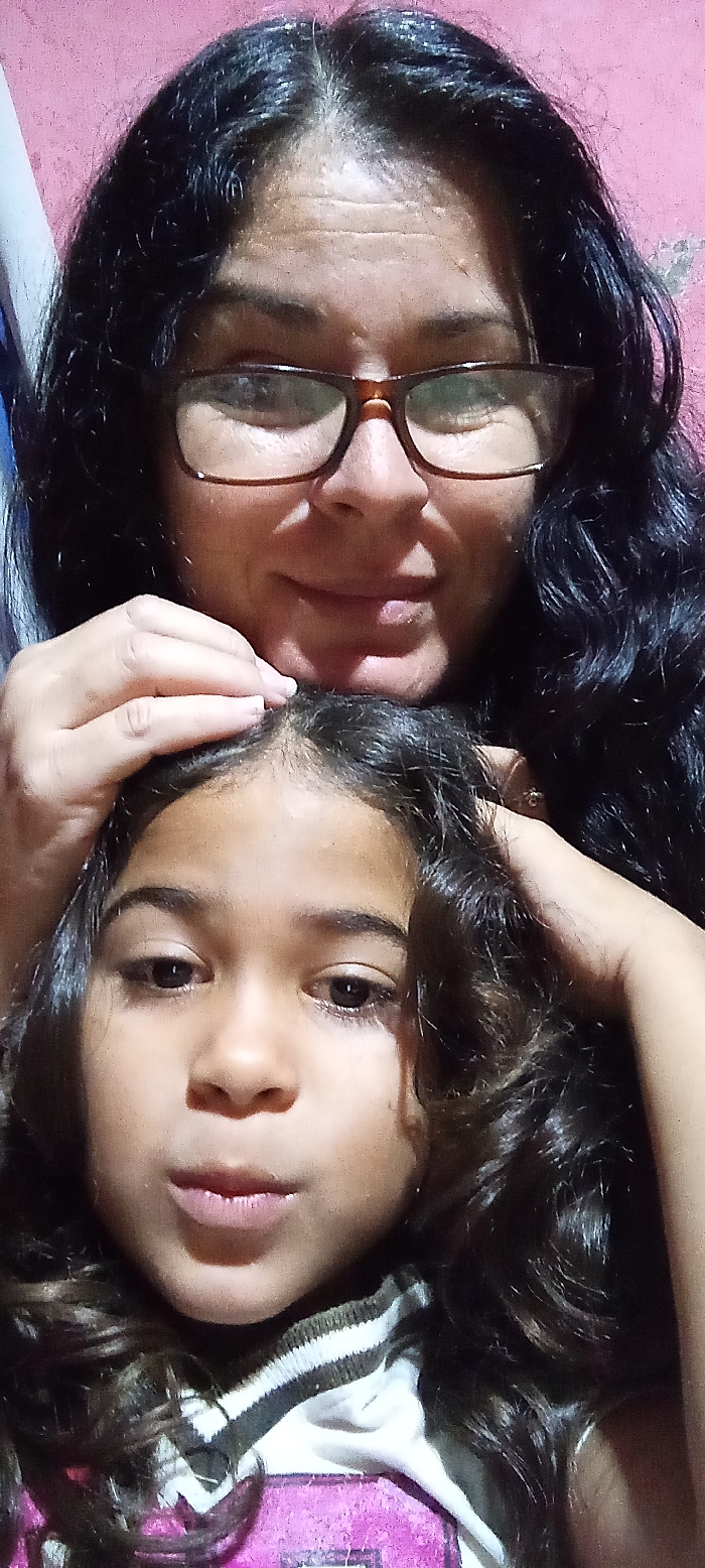 A woman with glasses and dark, wavy hair is seen from the shoulders up, smiling slightly. Her hand rests on the head of a younger child below her, also with dark, wavy hair. The child faces the camera with a neutral expression. The background appears to be a pink or red wall. The overall image is a close-up, intimate portrait.
