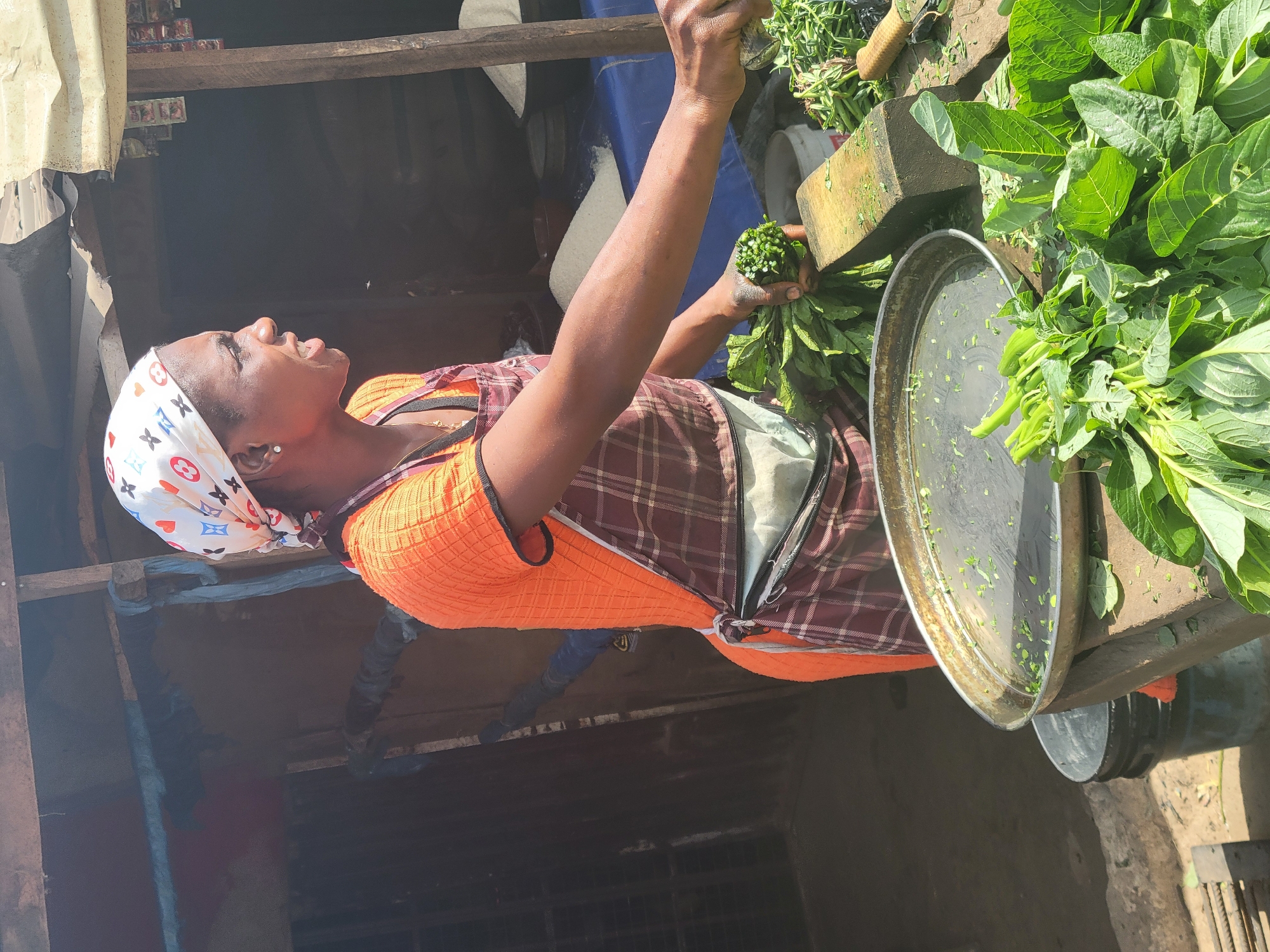 A woman is standing at a table in a market in Madalla, Nigeria. She is wearing an orange top, a brown and white plaid apron, and a white headscarf with red and blue designs. She is looking up and to the left while holding and chopping greens with a knife on a wooden block. A metal tray sits nearby, holding chopped greens. More greens are piled on the table around the block. The market stall is covered with a roof, with the underside exposed, revealing a wooden frame and various materials.
