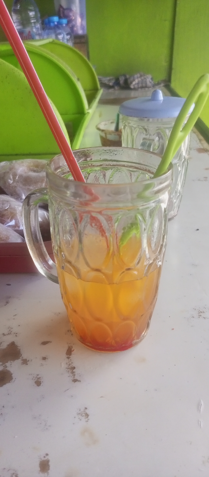 glass of orange juice with a red straw and a green straw in it. The glass is sitting on a white table. There is a green plastic container in the background with a few items inside. The glass is sitting next to a second glass jar with a blue lid and a green straw. The image was taken in Kecamatan Waru, Indonesia. The coordinates are -7.35 latitude and 112.764 longitude.