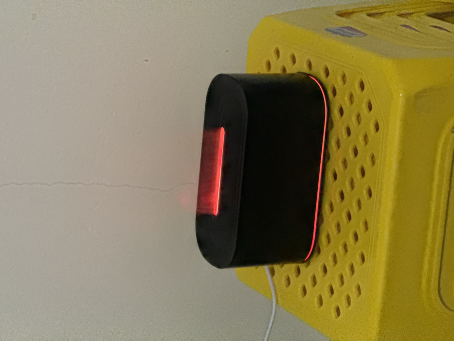 A black, elongated oval-shaped electronic device is centrally positioned on a bright yellow plastic stool within an indoor setting in Cam Đức, Vietnam. The device features a continuous red LED light strip along its bottom perimeter and emits a red glow with a faint, translucent plume, consistent with vapor, from a central aperture on its top surface. A thin white cable is visible extending from the left side of the device. The yellow stool has a textured, grid-patterned, perforated top surface. The background consists of a plain, light-colored wall, which exhibits a distinct vertical hairline crack running from the upper portion of the frame towards the device. No individuals are present in the scene.