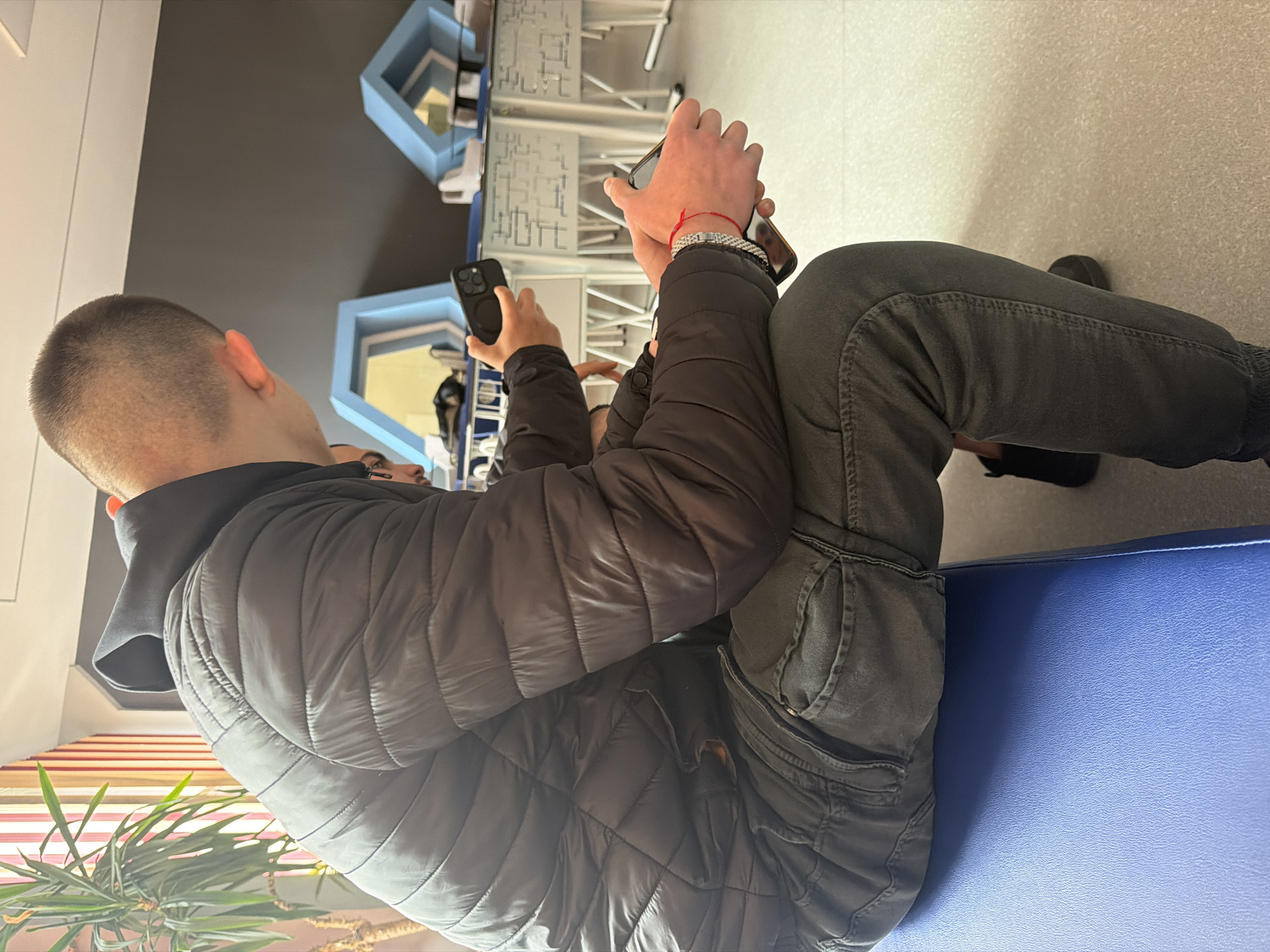 A man is sitting on a blue chair while holding two smartphones. He is wearing a dark, hooded puffer jacket and dark grey pants. The scene appears to be indoors, with a black wall in the background and geometric blue shapes on the wall. There is a plant in the foreground on the left. The image does not depict enough information to determine it is in General Toshevo, Bulgaria.