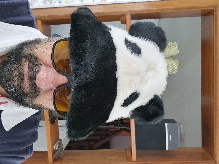 A man wearing yellow-tinted glasses and a blue sweater is partially visible. His face is turned towards the left, obscured by a large, furry panda hat. The hat is black and white, with distinct panda ear shapes on top. The scene is framed by a wooden structure resembling a shelf or cabinet. In the background, a gray object (possibly a speaker) and a light-colored decorative item are visible against a light gray wall.