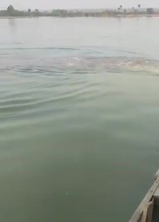 A wooden boat is moving on a body of water that appears to be a river or a lake. The water's surface is active, with ripples and a muddy patch visible beneath. On the boat, a person wearing white sandals stands by the side. The camera's angle shifts, and the focus is directed to the river's surface. Later, the camera's focus shifts again to capture a woman standing on the boat, wearing a green top and black skirt, positioned near a silver car. Behind her, other individuals can be seen in the boat, along with additional boats in the distance.