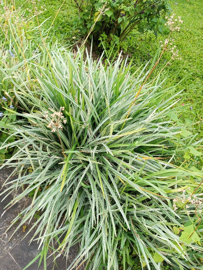 variegated grass plant with long, slender leaves that are primarily green with white stripes. The plant is densely packed, forming a rounded shape. In the background, there is green grass and a small shrub. The grass is positioned near a gray concrete edge. Some of the grass blades have dried and turned brown. Small seed heads are visible amidst the foliage.