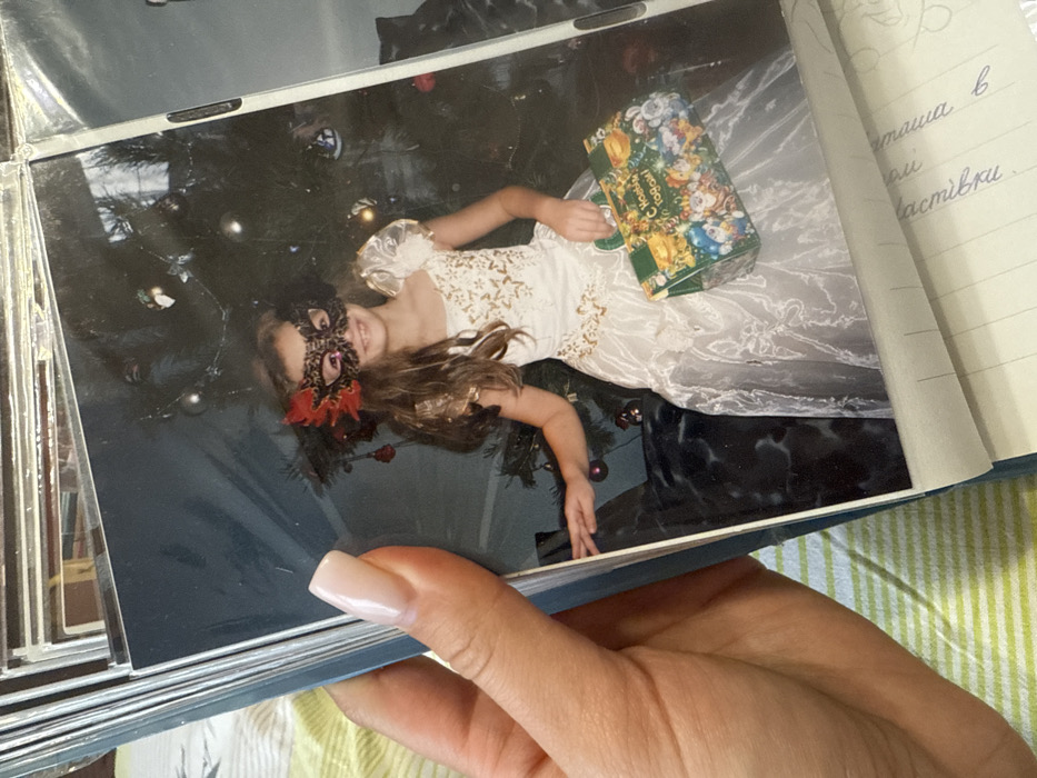 The image displays a physical photograph held within a blue photo album by a human hand. The hand, exhibiting a light-toned skin and a manicured light pink fingernail, grips the left edge of the album. The photograph, depicting a festive indoor scene located in the city of Kyiv, Ukraine, features a young girl positioned centrally. The girl has long brown hair and wears a white, possibly satin, gown with gold embroidered patterns and sheer, puffed sleeves. Her eyes are covered by a leopard-print masquerade mask embellished with red and black feather or floral accents. She smiles faintly. In her left hand, she holds a rectangular green tin box adorned with various cartoon characters, including what appears to be Santa Claus figures, and the Cyrillic text "С НОВЫМ ГОДОМ!" (Happy New Year!). Behind the girl and the tin box, a decorated Christmas tree is visible, featuring silver and red/purple spherical ornaments. Below the tree, a dark, upholstered surface, possibly a sofa or chair, is present. Beneath the displayed photograph, pages of the photo album show handwritten Cyrillic text. To the far left of the entire frame, a light green and white striped textile pattern is partially visible.