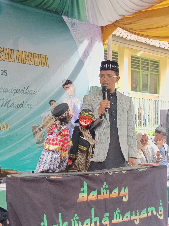 A man wearing glasses and a black patterned taqiyah is speaking into a microphone. He's wearing a gray blazer over a black shirt. Behind him is a banner with text. In front of him, two puppets are on a black table with printed text, one in red and the other in various colors. Behind the man are people watching. The scene appears to be at an outdoor event, with the backdrop of a building and draped fabric.