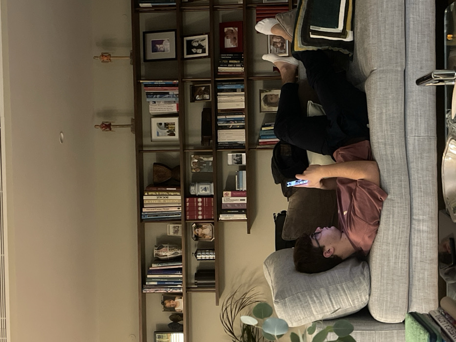 The image displays an indoor living space located in Matosinhos, Portugal. A young adult male, wearing a maroon t-shirt, dark trousers, and white socks, is reclining on a light grey fabric sofa. He lies on his back, propped against a sofa cushion, with his legs bent and feet resting on a dark green, white, and black patterned throw pillow. He holds a smartphone with both hands, viewing its illuminated screen. The background features a large, dark wooden bookshelf unit spanning the wall, filled with numerous books, various framed photographs (including portraits of individuals and groups), decorative vases (one patterned, one dark), a wooden goblet, a white and blue patterned lidded jar, and two small red-chested anatomical figurines positioned on the top shelf. A houseplant with circular leaves and a stack of books are visible in the lower-left foreground, while a silver-colored bowl and another dark object are partially visible on a surface in the lower right. The scene is illuminated by warm, artificial light.