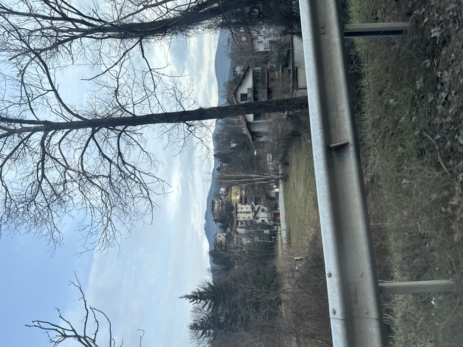 The image depicts a residential area in Vladaya, Bulgaria, viewed from a slightly elevated position. In the immediate foreground, a metallic grey guardrail extends horizontally across the lower portion of the frame, secured by visible bolts. A reddish-brown linear mark or streak is present on the right section of the guardrail. Below the guardrail, the ground is covered with dry, sparse vegetation and brown underbrush. Beyond the guardrail, a gently sloping grassy field or clearing occupies the midground. To the left, a paved road or pathway is visible, curving slightly. Along this road and further into the midground, several multi-story residential buildings are situated amidst a dense collection of deciduous trees, currently bare, and some evergreen conifer trees. Notable structures include a building with a yellow facade on the left and various other buildings of light colors (grey, beige, white) with dark roofs, some featuring visible balconies. A street light pole stands near the road. In the background, the scene transitions into a series of rolling hills or mountains, densely covered with both deciduous trees (bare of leaves) and evergreen vegetation. The sky overhead is overcast, displaying a gradient of light blue and grey cloud cover. No individuals or specific activities are discernible within the frame. The overall environment suggests a transitional season, likely late winter or early spring.