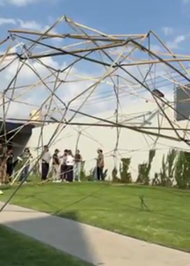 partially collapsed bamboo structure resembling a geodesic dome in a grassy outdoor area. The structure is made of interwoven bamboo poles and ropes, with some sections still standing while others are bent or broken. A group of people are standing nearby, observing the structure. The environment includes a well-maintained lawn, a paved walkway, and a white building with green landscaping in the background. The sky is blue with scattered clouds, suggesting a sunny day. The camera slowly pans across the structure, providing a detailed view of the damage and the people present.