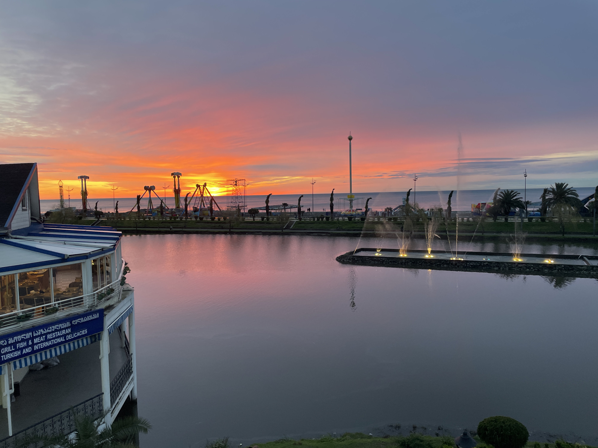 sunset view in Batumi, Georgia, overlooking a lake. The sky is a gradient of orange, pink, and purple. On the left, a partially visible building with a restaurant sign is situated. The sign is in Georgian and English, indicating "Grill Fish & Meat Restaurant, Turkish and International Delicacies". Across the lake, there is an amusement park or fairground with various rides. Fountains are visible in the water. Palm trees dot the landscape on the right side of the lake. The water reflects the colors of the sunset. A shoreline with green vegetation is visible in the foreground.