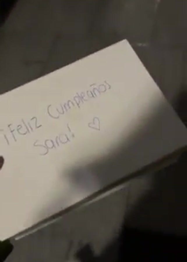 The video begins with a close-up shot of a white card with a handwritten message that reads "¡Feliz Cumpleaños Sara! [Heart]"