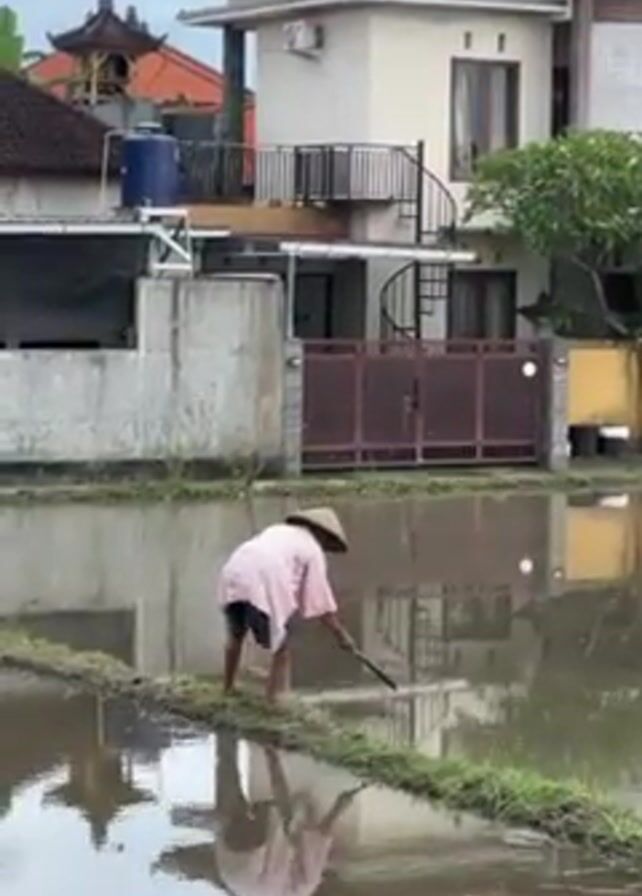 person wearing a conical Asian hat and light pink long-sleeve shirt, working in a flooded rice paddy. They are bent over, using a tool in the mud. Behind the paddy are modern houses with red tile roofs, fences, and spiral staircases. The sky is overcast.