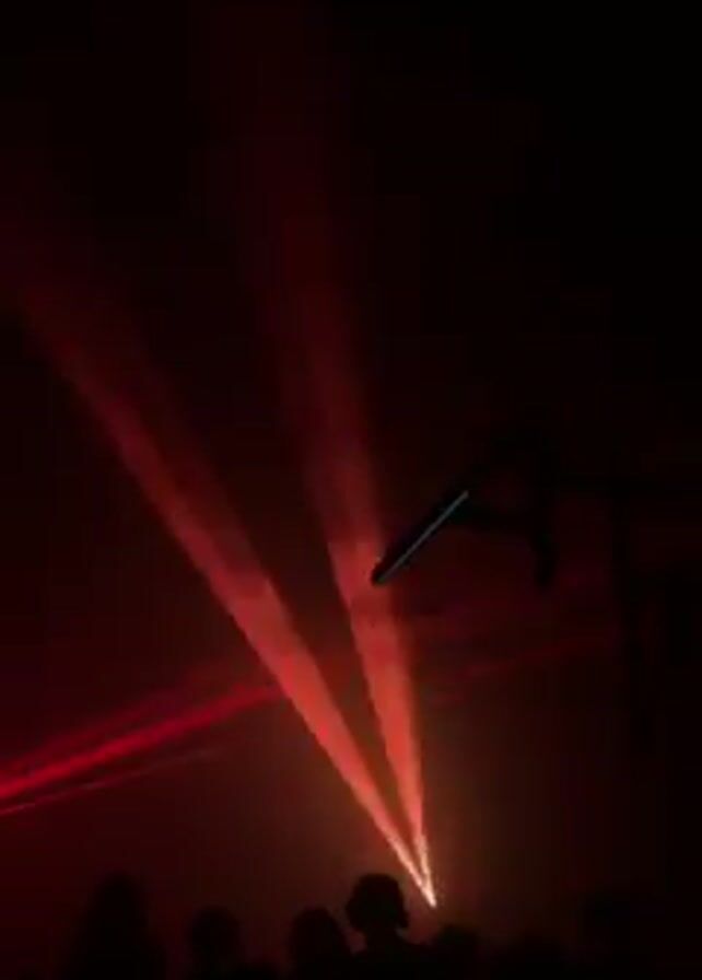 dimly lit scene, likely a concert or club, with people silhouetted in the foreground against a backdrop of red laser beams
