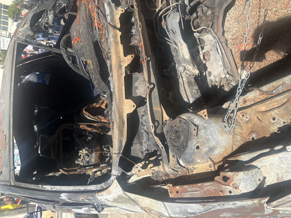 - "The image displays a severely fire-damaged, dark-colored vehicle, likely a sedan, situated outdoors on what appears to be a paved surface in Tel Aviv, Israel" by FM-iKPZ32, licensed under CC BY 4.0