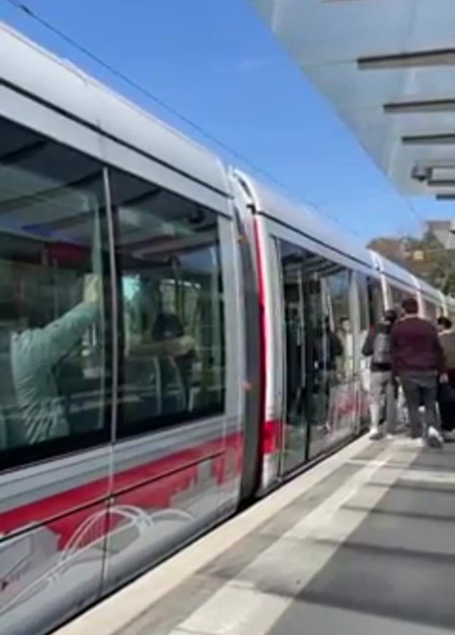 A modern tram waits at an outdoor station on a sunny day. Several people, mostly men, stand on the platform, waiting to board or having just exited the tram. The tram is painted silver with a broad red stripe and etched images of city scenes near the bottom. The station has a transparent roof for shelter. The scene is brightly lit.