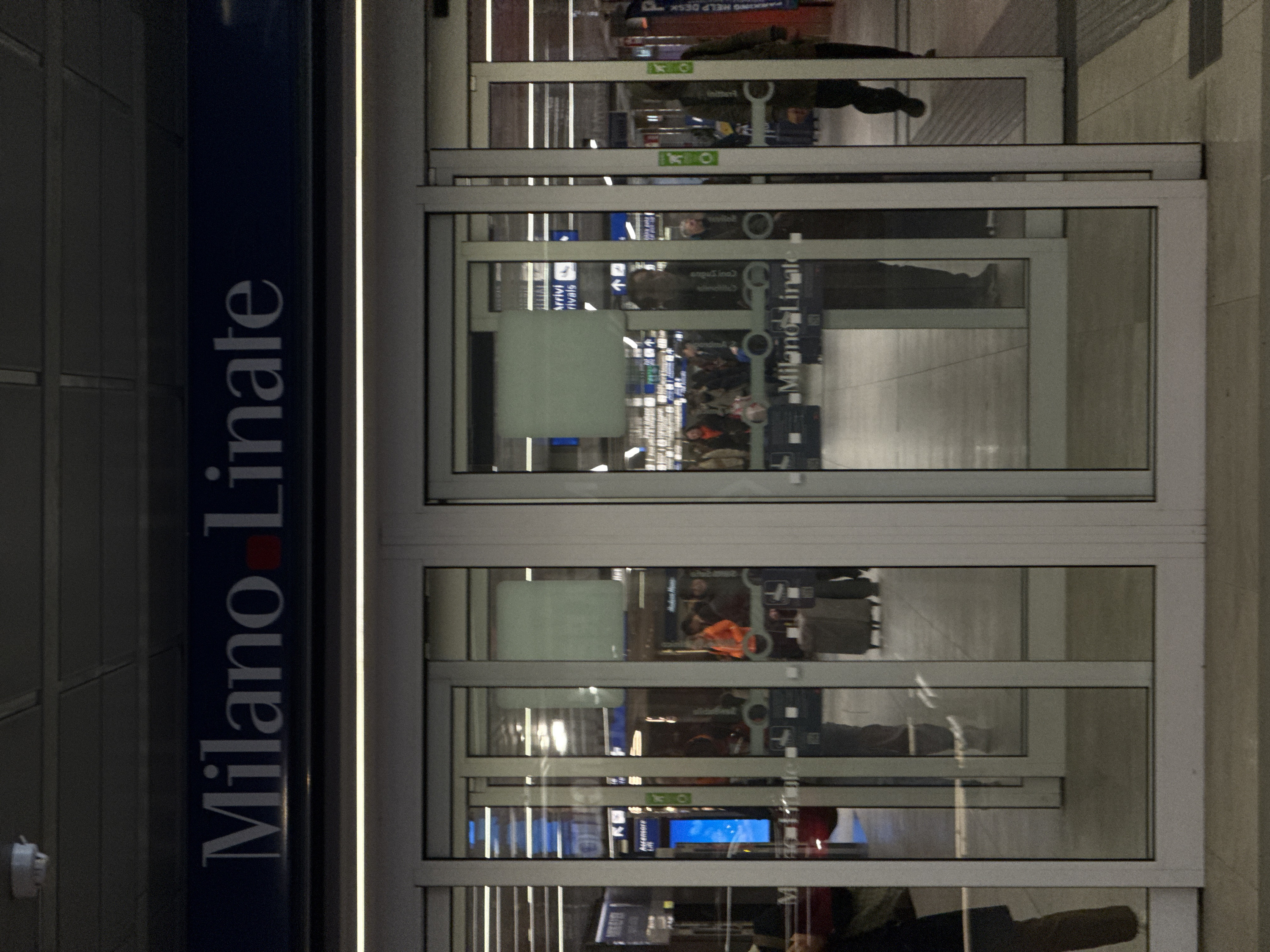 - "The image displays the entrance to an indoor facility, identified by a prominent dark blue sign overhead that reads "Milano Linate" in white capital letters, with a red square between the two words" by FM-euyLP2, licensed under CC BY 4.0