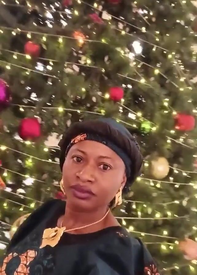 A woman stands in front of a large Christmas tree. The tree is decorated with various ornaments and lights. The woman is wearing a dark green outfit, gold earrings, and a gold necklace. She has a dark-colored head covering. She is looking directly at the camera. The background is a bright indoor space with large windows.