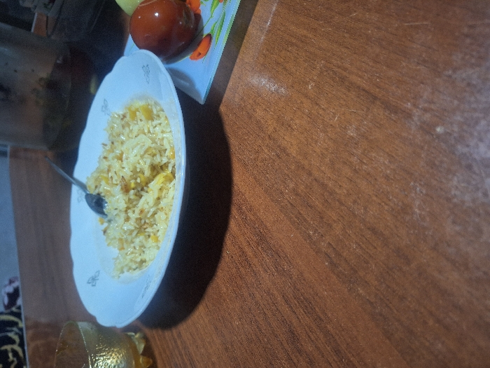 The scene is set indoors on a brown wooden table, observed in Khanka, Uzbekistan. No individuals are visible. The primary subject is a meal laid out on the table. In the mid-ground, a white ceramic plate with a scalloped edge and faint decorative patterns contains a serving of yellowish-white rice, consistent with pilaf, mixed with some orange-colored ingredients and darker specks. A silver-colored spoon rests within the rice. To the immediate left of the plate, a textured, amber-colored glass is present. To the right of the plate, a small, clear glass dish with a design of red and green chili peppers holds a single round, red tomato and a partially visible lighter-colored vegetable or fruit. In the blurred background, a dark, partially filled carafe or bottle is visible behind the plate. Above the carafe, a patterned fabric, possibly a tablecloth or curtain, is discernible. The wooden table surface in the foreground and mid-ground exhibits visible wood grain and light dust or particulate matter. The lighting suggests an ambient indoor setting, creating shadows beneath the plate and other objects. No actions or interactions are depicted; the scene is static.