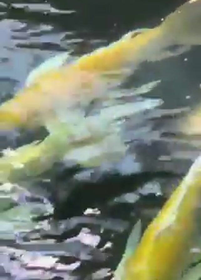 several large, yellow and white koi fish swimming in a dark pond. Sunlight reflects off the water's surface, creating shimmering patterns. The fish are active and move around each other, occasionally surfacing. The water is murky, with fallen leaves visible.