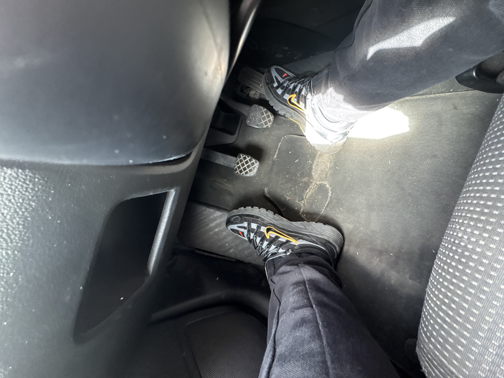 The image displays a first-person, downward-angle view of a vehicle's driver-side footwell, capturing the operator's legs, feet, and the pedal cluster. The precise location within Stara Zagora, Bulgaria, is not discernible from the interior scene. The operator's legs are clad in dark grey jeans. Both feet are shod in identical athletic shoes, characterized by black and grey uppers, a distinct yellow Nike "swoosh" logo on the lateral side, and a thick, textured black sole. The left foot rests on the dark grey floor mat, positioned to the left of the clutch pedal. The right foot is angled with the toe positioned above or on the accelerator pedal. The vehicle is equipped with a manual transmission, evidenced by three distinct pedals: a textured clutch pedal on the left, a textured brake pedal in the center, and a narrower accelerator pedal on the right. The dark grey floor mat exhibits minor dust and scattered debris. Above the pedals, dark grey plastic interior trim is visible, including a small recessed storage area to the upper left. A section of the driver's seat, upholstered in dark grey fabric with a repeating pattern of small white dots, is visible in the lower-left foreground. Natural light illuminates the right side of the scene, casting a bright highlight on the right leg and a portion of the floor.