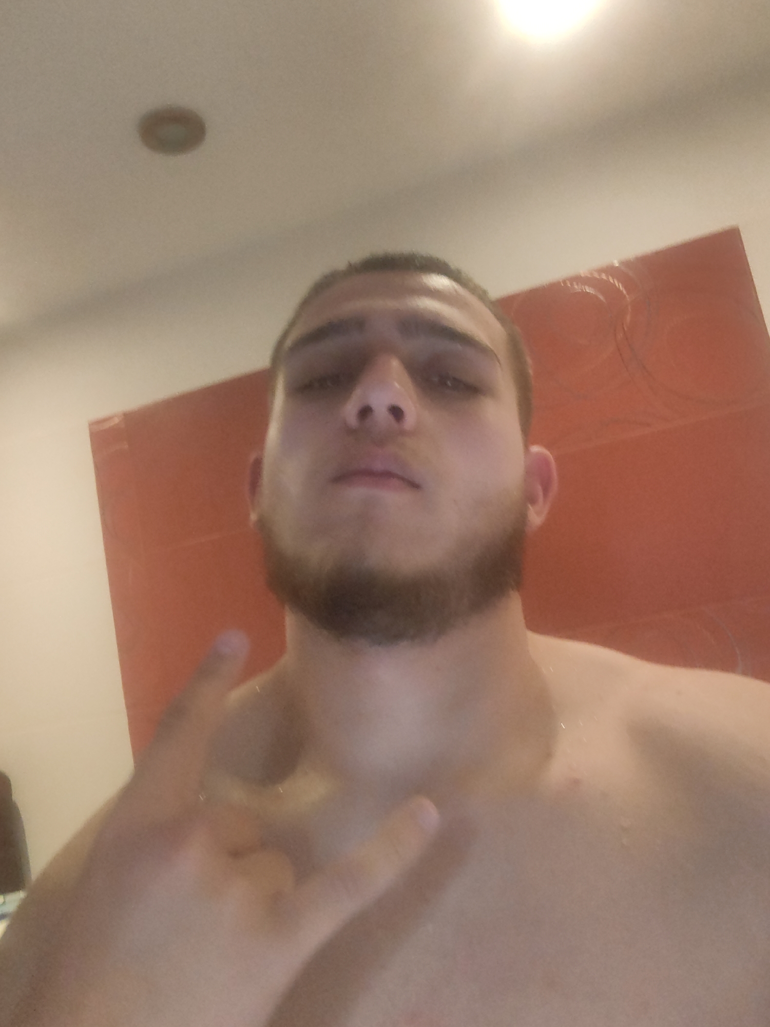 The image displays an indoor scene in Sofia, Bulgaria, featuring a male subject. The individual, a young adult, is centered and framed from the upper chest to above the head. He has short, dark hair, a trimmed dark beard, and a mustache. His eyes are open, and his gaze is directed towards the camera with a neutral expression. The subject is shirtless, revealing his bare shoulders and upper chest. His left hand is raised to approximately chest height, forming a "rock on" gesture with the index and pinky fingers extended and the other fingers curled. A slight sheen or moisture is visible on the subject's skin, particularly on the right shoulder. The background consists of an interior space with a light-colored ceiling and wall section on the left. A circular, recessed light fixture is visible on the ceiling. To the right, a prominent section of the wall is colored a uniform red or orange hue, displaying faint circular patterns or textures on its surface. The scene is illuminated by artificial light, with a bright light source causing a flare in the upper right quadrant of the image. No other individuals or specific identifiable objects are present within the frame.
