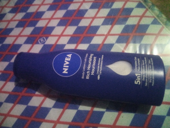 bottle of Nivea Rich Nourishing Body Lotion. The dark blue bottle features a prominent Nivea logo and claims "5in1 Complete Care." It also specifies "Intense Moisture" for 48 hours. The bottle rests on a surface with a blue and white checkered pattern intersected by red lines. The image seems casually taken, possibly indoors.