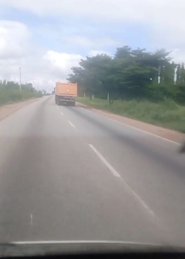 view from inside a vehicle moving on a road. An orange dump truck is driving ahead in the same lane. The road has a white line marking the center and is flanked by green vegetation and trees. The sky is partially cloudy. The video appears to be shot during daylight.