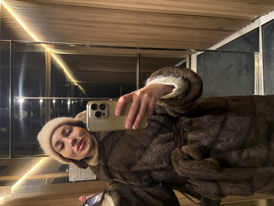 A woman in a beige beanie and brown fur coat takes a selfie in a mirrored elevator