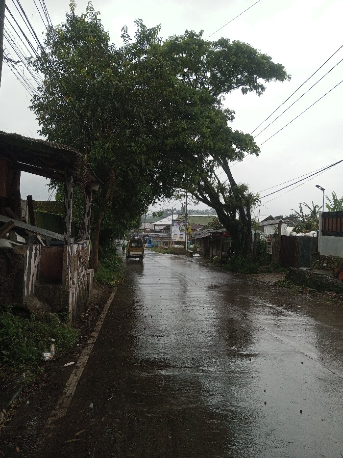 A wet street stretches into the distance under a cloudy sky. A light-colored van travels down the road. Buildings line both sides of the street with small shops visible ahead. Lush green trees arch over the road on the left. Powerlines crisscross the sky above. The road surface reflects the ambient light, appearing slick with rain. Small piles of debris sit near the roadside structures.