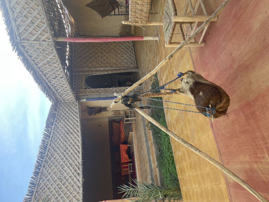 A camel carcass hangs from a makeshift gallows of wooden poles and blue ropes. The scene occurs in an open courtyard or patio with light yellow walls and a red ground. Wicker roofing is visible, along with patio furniture and a doorway. The environment appears to be in a warm climate.