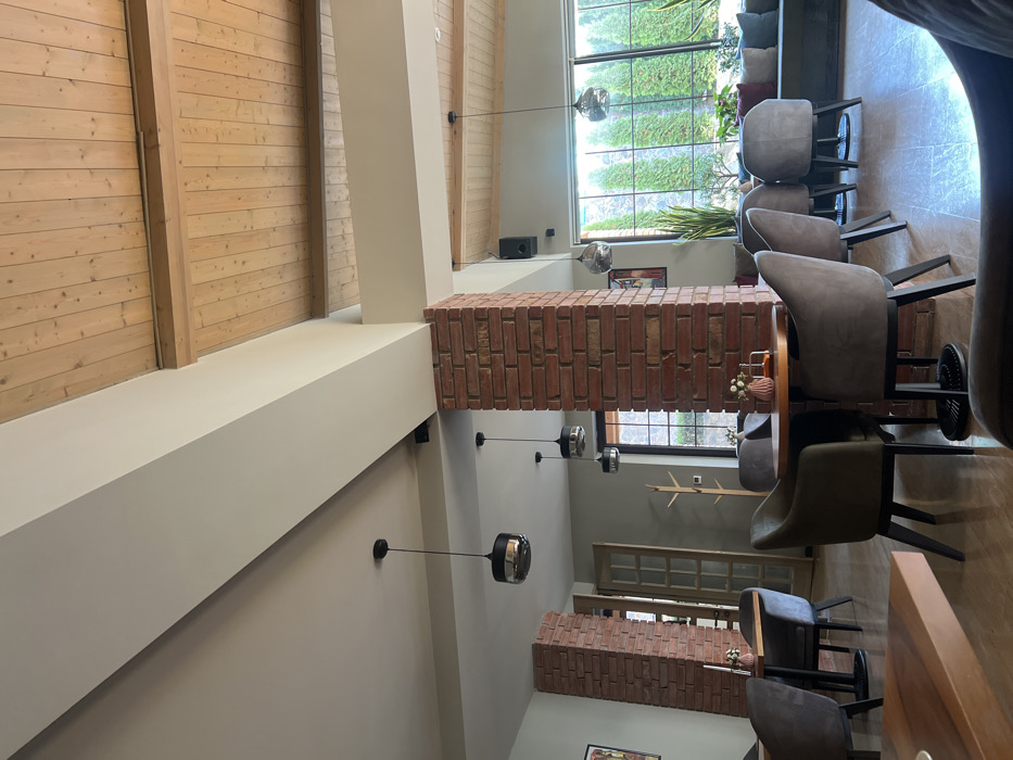 This image depicts the interior of a commercial establishment, identified as a cafe or restaurant, located in Dilijan, Armenia. The scene is static and unoccupied by individuals. The architectural design integrates rustic and modern elements. The ceiling presents a multi-level structure with flat, light beige sections transitioning into pitched sections paneled with light-toned wooden planks and exposed wooden beams. Multiple contemporary pendant lights are suspended at varying heights; these fixtures consist of black cylindrical tops and reflective, smoked-glass dome bottoms. Two substantial, rectangular pillars constructed from reddish-brown exposed brick are prominent within the space. Walls are painted a consistent light gray. Seating arrangements include numerous round tables with dark tops and central pedestals, each surrounded by upholstered chairs in shades of dark gray, brown, and olive green. Along the right side of the frame, a continuous dark-upholstered bench seat is positioned beneath a large expanse of multi-paned windows. These floor-to-ceiling windows offer a clear view of the exterior, revealing a dense row of tall, conical evergreen trees and other green foliage. Interior decorative elements include small, light-colored vases with minimal floral arrangements on the tables, a wooden coat rack with multiple pegs situated in the background, a snake plant, and other potted plants placed near the windows. Portions of framed artwork are discernible on the walls. A light-colored wooden door with multiple glass panes is partially visible in the left background. The flooring appears to be a light-colored hard surface. No actions or interactions are occurring.