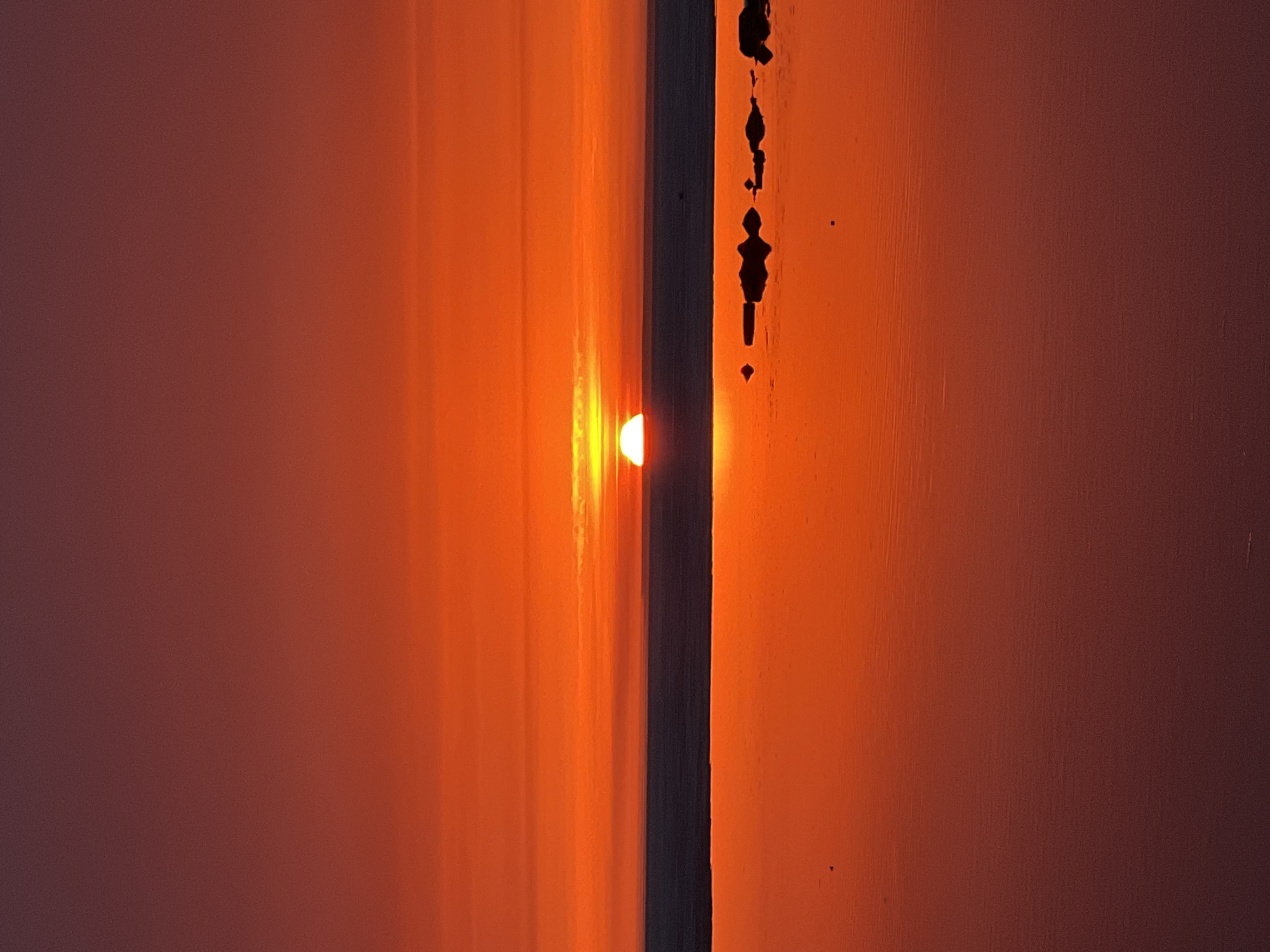setting or rising sun partially obscured by a dark vertical object, possibly a wooden beam or post, dividing the frame