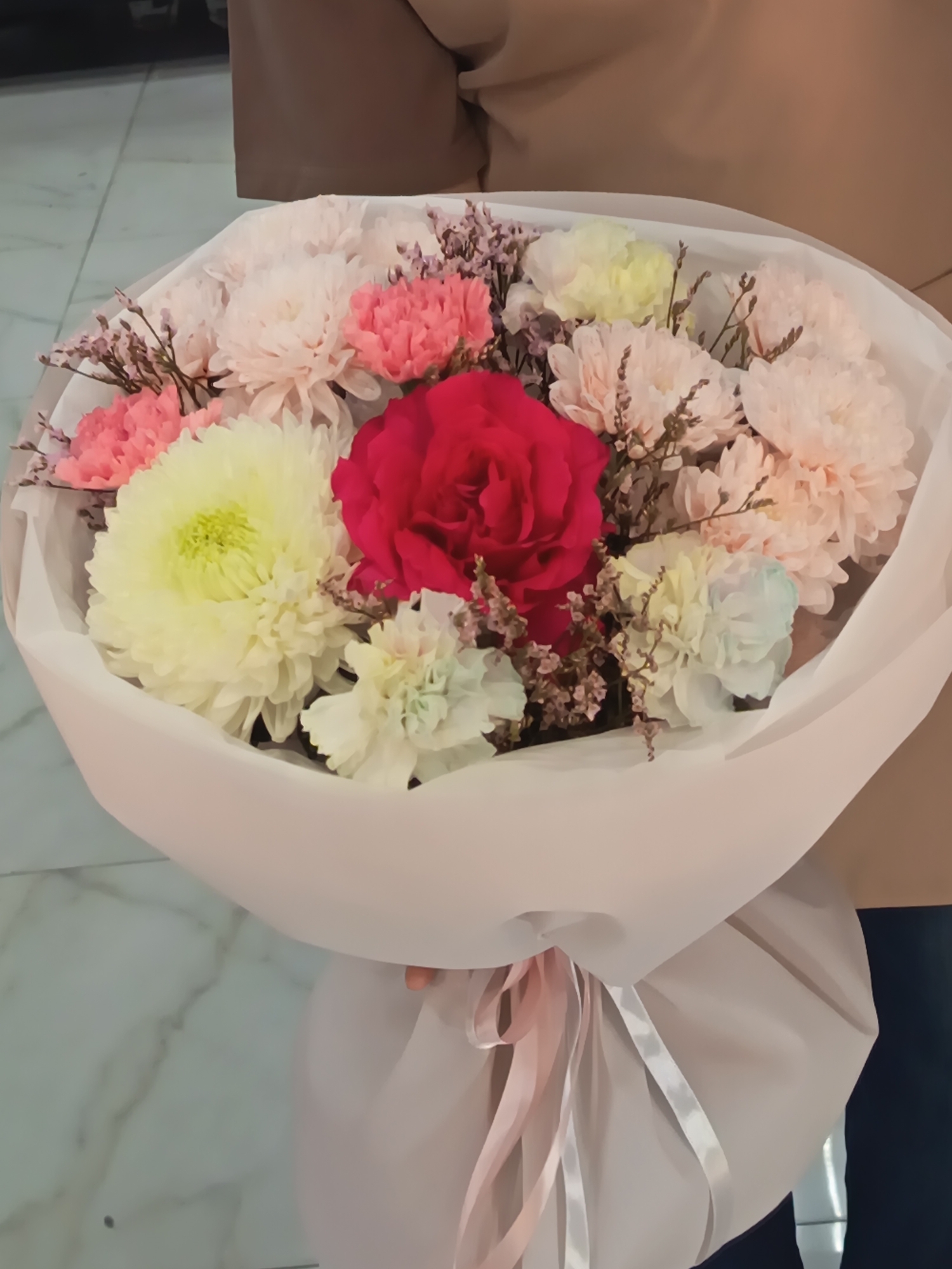 bouquet of flowers held in someone's hands. The bouquet is wrapped in white paper and tied with a light pink ribbon. The flowers include a red rose, white and yellow chrysanthemums, pink carnations, and some smaller brown flowers. The background is blurry, but it appears to be an indoor setting with a tiled floor. There is nothing to suggest the location is in Nizhnevartovsk, Russia.