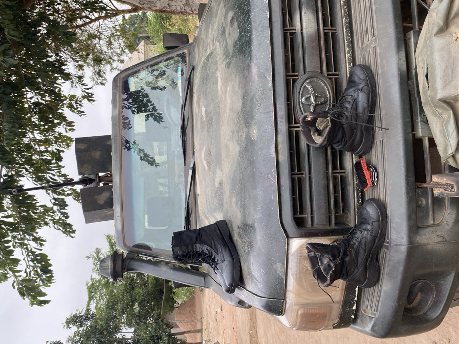 The image displays a dark green, dusty, modified Toyota Land Cruiser-type vehicle parked on dirt ground in Kado, Nigeria. The vehicle's front section is prominent, featuring a snorkel on its left side and a visible Toyota emblem on the front grille. A heavy machine gun, flanked by two rectangular dark armored plates, is mounted on the vehicle's roof, positioned behind the windshield. A pair of new-appearing black laced combat boots rests on the vehicle's hood. On the front bumper/grille, a second pair of visibly worn black laced combat boots is present, alongside a circular black shoe polish container and a red and black shoe brush. The background consists of sparse green trees and vegetation, a large pile of reddish-brown earth to the left, and a partially obscured light-colored building in the distance. The sky overhead is overcast or hazy. No individuals are visible within the frame. The arrangement of boots and cleaning supplies suggests recent or impending maintenance activity.