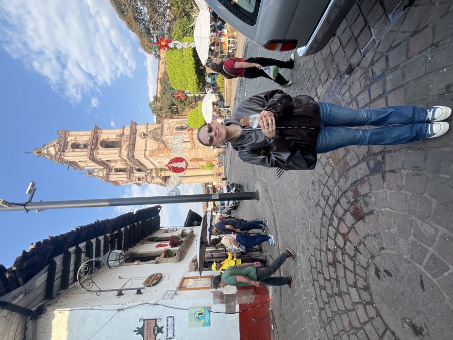 A woman in jeans and a jacket stands on a cobblestone street holding a drink. Behind her is a tall, ornate church tower and street decorations. People are seated at tables with umbrellas. A building with a white facade and red brick accents is on the left. The sky is blue with scattered clouds. A car's rear end is visible in the top right corner.